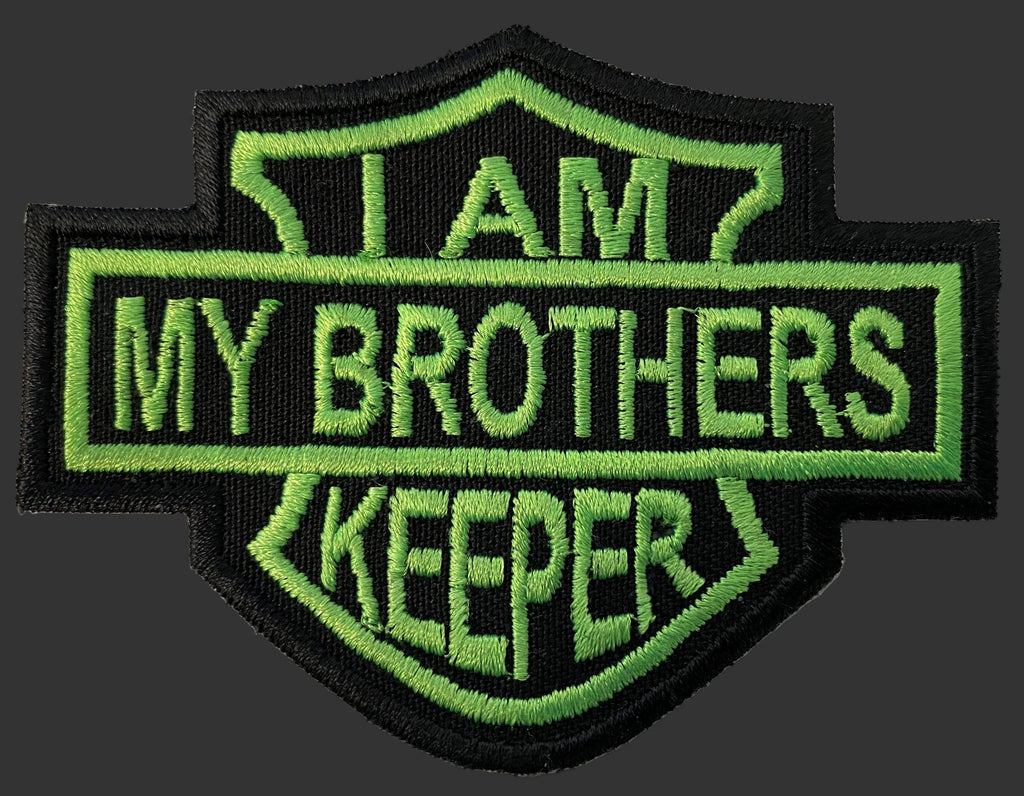 Premium Quality Embroidered Iron-On Patch that reads 'I AM MY BROTHERS KEEPER' in Lime Green lettering
