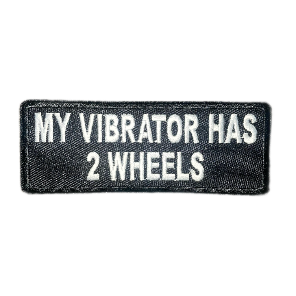 Premium Quality Embroidered Iron-On Patch that reads 'My Vibrator Has 2 Wheels' in white lettering